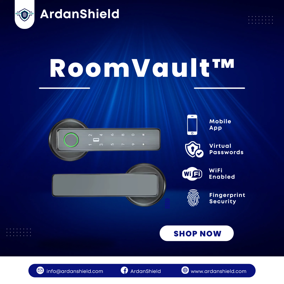 Discover the ArdanShield RoomVault™, the ultimate smart lock designed for modern living. With multi-access options, sleek design, and advanced security features, it’s perfect for securing personal spaces, offices, or shared environments. Say goodbye to traditional keys and embrace the future of security today!