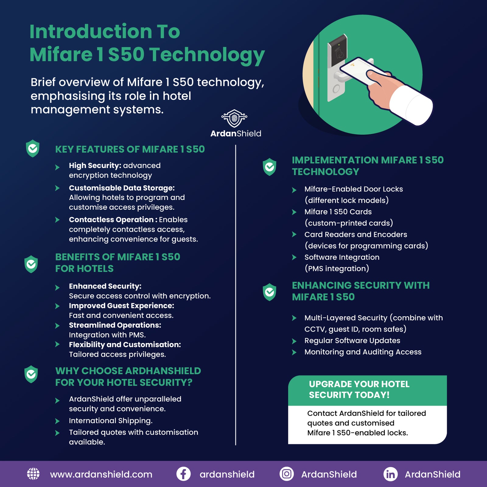Discover how ArdanShield’s latest range of hotel door locks, powered by Mifare 1 S50 technology, can revolutionise your hotel’s security and operations. Our comprehensive guide delves into the features, benefits, and implementation requirements of this advanced system, offering valuable insights for hotel managers looking to enhance security and improve guest experiences. Learn about the seamless integration with Property Management Systems, the enhanced security protocols, and the convenience that Mifare 1 S50 technology brings to both guests and staff. With international shipping and tailored solutions, ArdanShield is your partner in creating a secure and efficient hotel environment. Read on to explore how Mifare 1 S50 technology can transform your hotel management system.